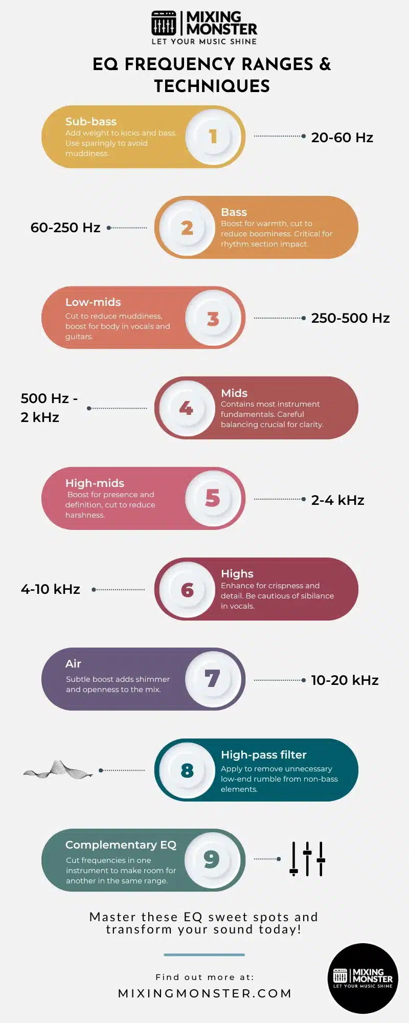 Understanding the frequency spectrum is essential for practical EQ application. Please familiarize yourself with standard frequency ranges and their associated characteristics in different instruments.